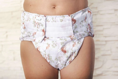 Vuxenblöjan är egentligen vad vi som håller på med tygblöjor kallar en pocketblöja, det vill säga att den har en innerficka där du stoppar inlägget. Insidan av blöjan besår av mjukt fleecetyg som håller dig torr. Det medföljande inlägget är gjort utav 4 lager absorberande bambu/polyester tyg som görs i Polen speciellt till Pupus. Tack vare fickan så kan man byta ut inläggen till tunnare/mindre om man inte behöver så mycket absorption eller lägga i flera inlägg om behovet är större. Inuti fickan finns knappar som du kan knäppa fast Pupus tillhörande inlägg i för att säkerställa att de ligger still. Blöjan har dubbla resårer runt benen för att hindra läckage och det är även väldigt ställbart med 3 höjdknappar i fram och kardborre för att justera midjestorleken optimalt. Yttertyget är gjort utav mjukt Pul tyg som andas, men ändå håller tätt.