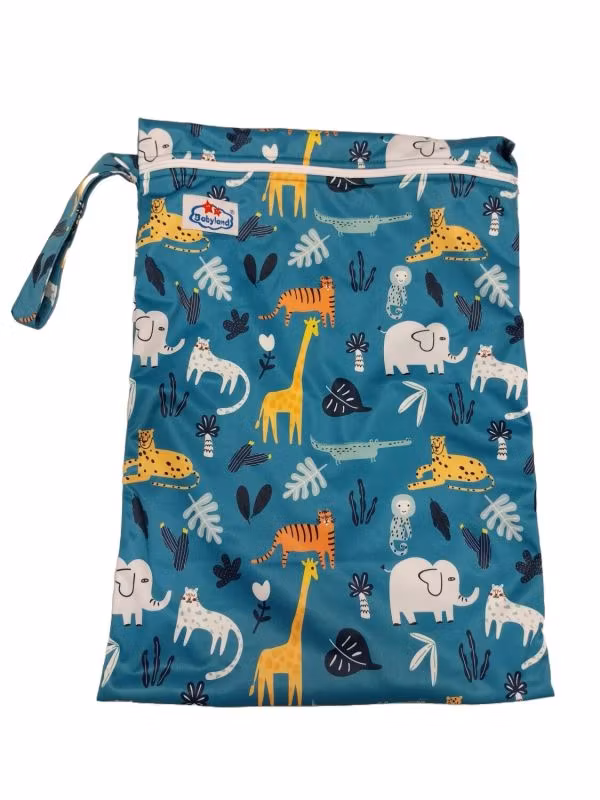 Babyland blöjpåse är tillverkad i vattentätt tyg och kan användas på många sätt. Den rymmer 4-5 blöjor, men kan också användas för fuktiga kläder, reservkläder eller liknande. Stängs med en dragkedja.