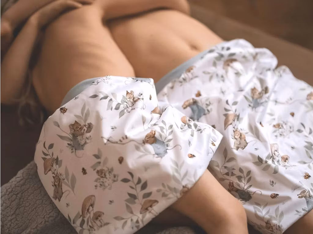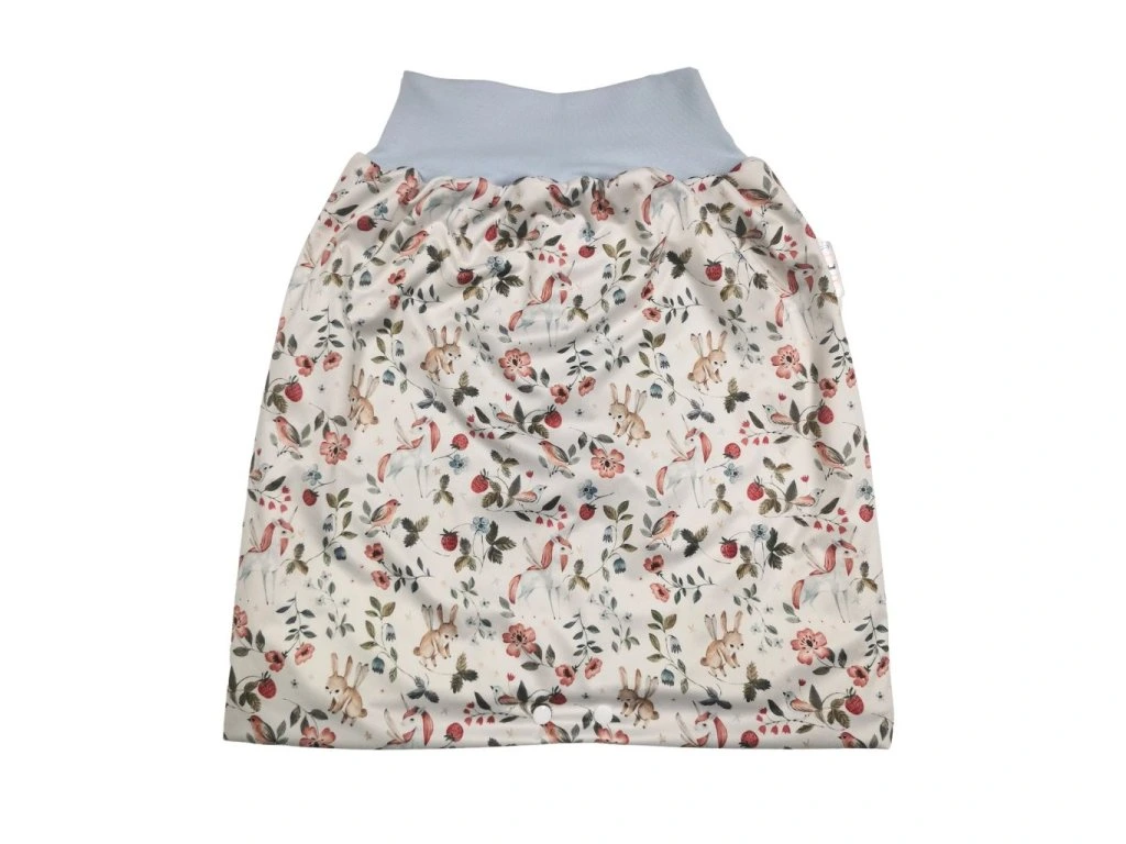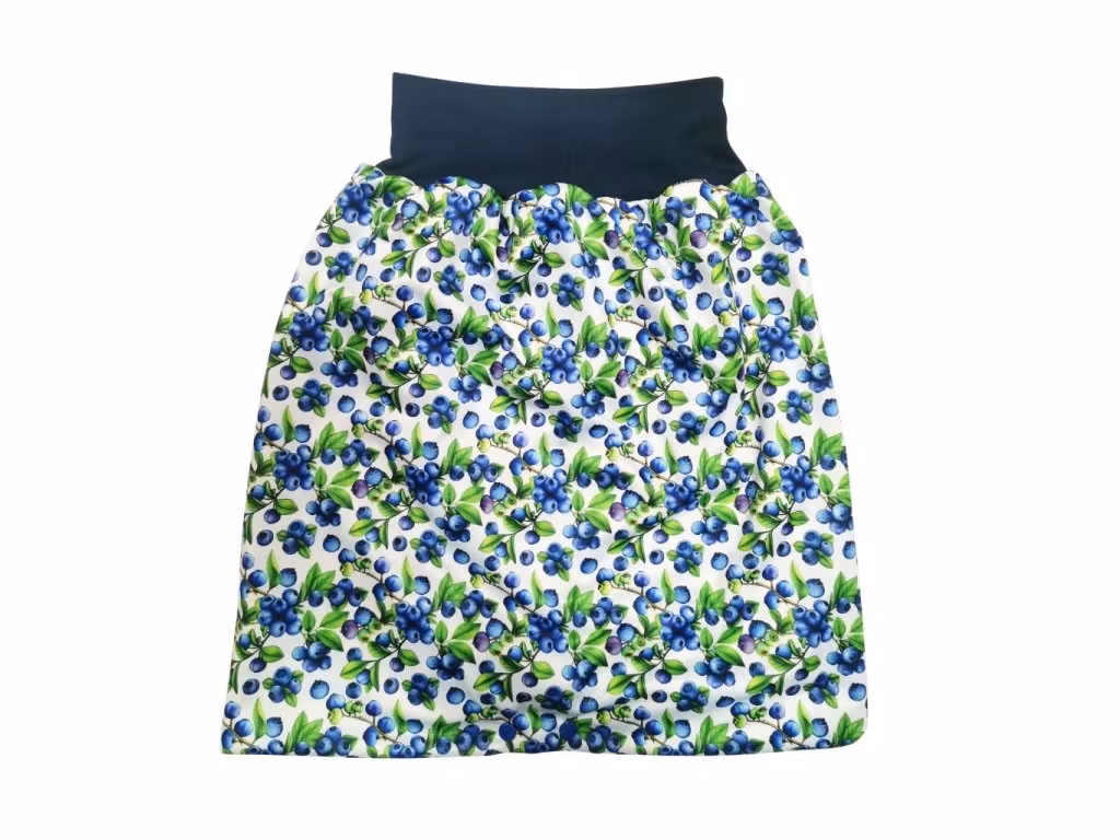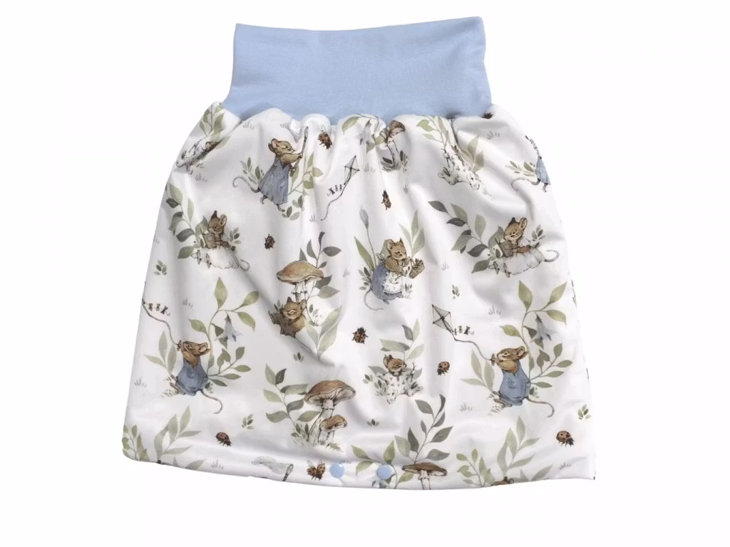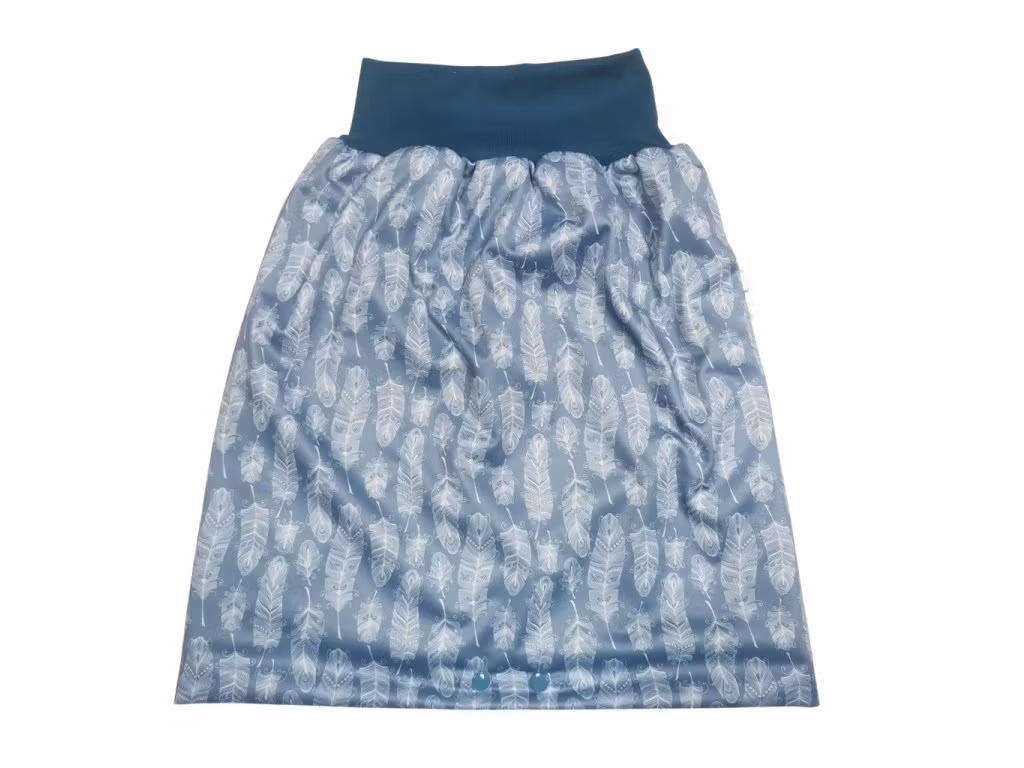 Det här är en kjol gjord för att hantera olyckor när barnet ligger och sover, åker bil eller dyl. Den har en utsida i vattentät PUL och insida i mjuk ekologisk, GOTS certifierad, bomullsfrotté. Midjan är i en bred och mjuk bomullstrikå. Nedtill finns 2 knappar så att den inte skall kunna åka upp, utan blir lite likt pösiga byxor om du knäpper dem. Bra om du tex har ett barn som rör sig mycket i sömnen.