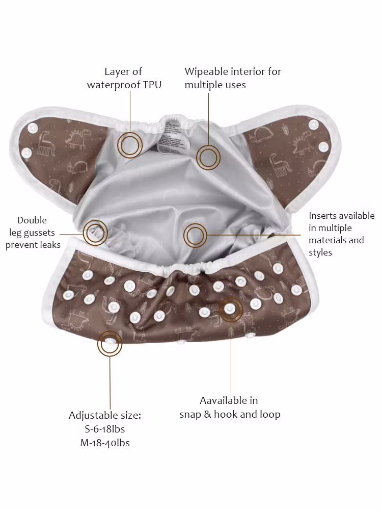 PUL-skalet stängs med antingen knappar eller kardborre. Storleken på tygblöjan justeras med hjälp av de främre knappraderna.