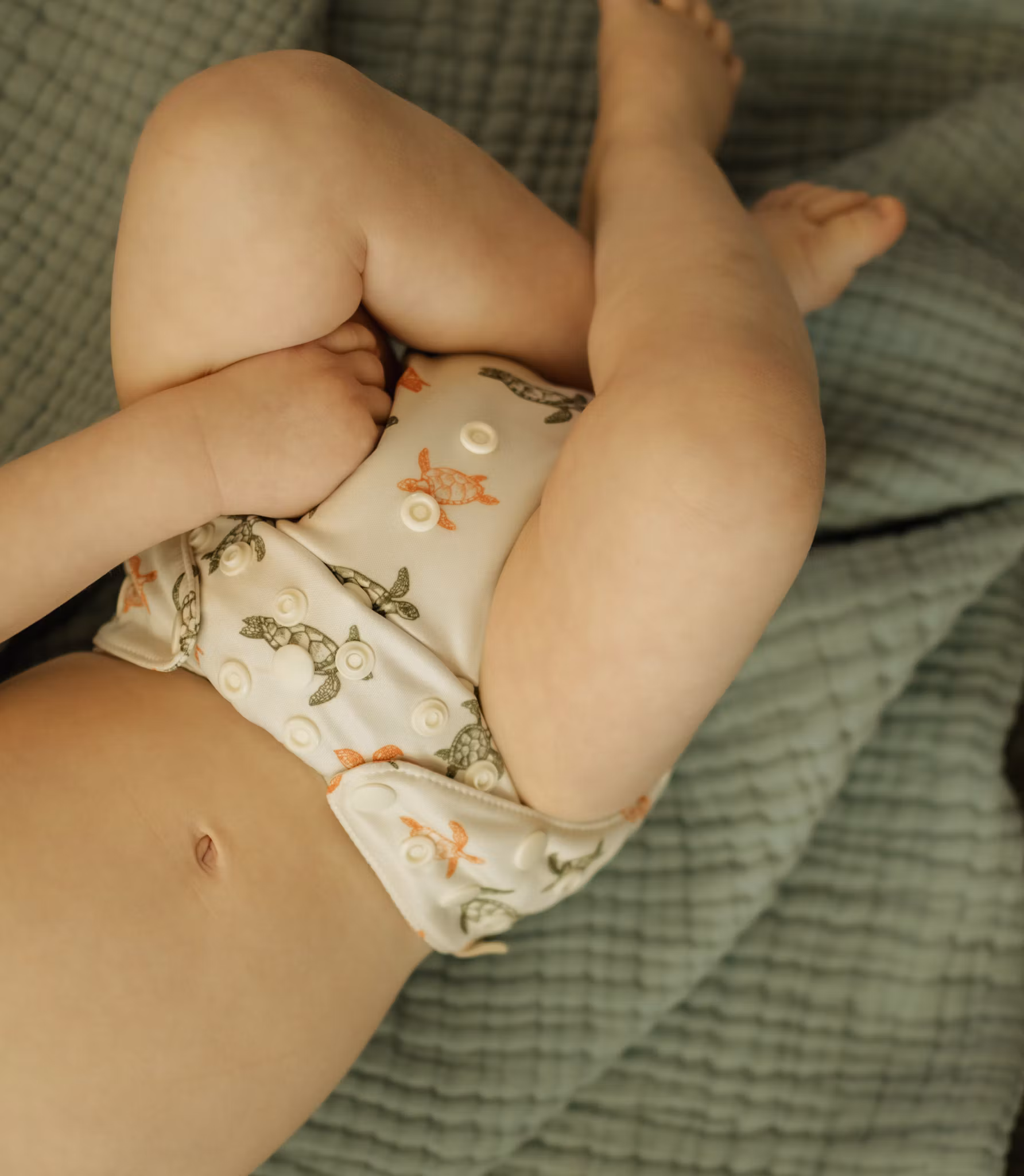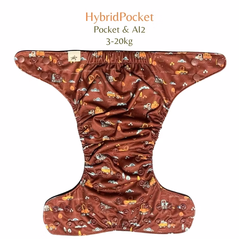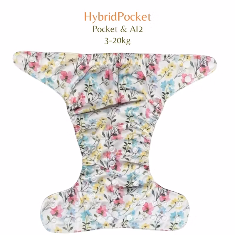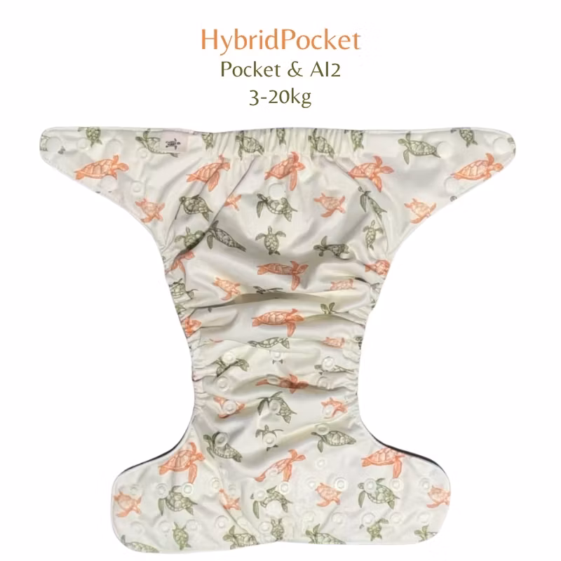 Tots & Turdle´s Hybridblöja är en mjuk och nätt pocketblöja, som även kan användas som en SiO/Ai2 blöja. Den har en insida av coolmax med en dubbelresår insydd i tyget. Det finns 2 stora öppningar, en bak och en framtill på blöjan, för att du enkelt skall kunna föra in/ta ur inlägg. Vill du hellre använda den som en SiO/Ai2 blöja sitter det en dold knapp i framkant och en dold knapp i bakkant. Tänk på att om det hamnar kiss på skalet behöver det tvättas efter varje användning till skillnad från en ren A12 blöja.